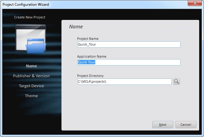 A project/application name can only contain alphabetic characters, numbers, and the underscore character “_” because the project name is also the directory's name on the drive where all project files are stored - "C:\MCL4\projects\Quick_Tour.PRJ".