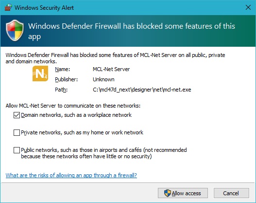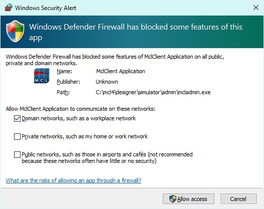 When the simulator is used for the first time, firewall messages are displayed. These messages depend on the application managing the firewall - an anti-virus software or Windows. The images below are examples of messages generated by Windows: