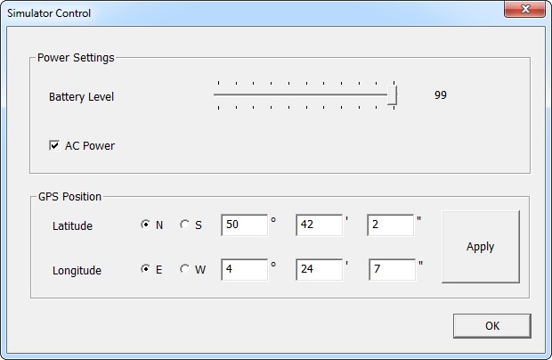 GPS Position Define the GPS Position values to be used when simulating GPS usage in a project. Click