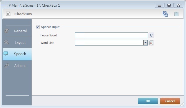 Select an App Word List from the drop-down list or click This implies the previous creation of an App Word List with the spoken words that represent the "Checked"/"Unchecked" values related to the "CheckBox" control. |