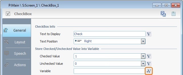 This topic only describes the speech related options included in a "CheckBox" control. For more information on this control, see Adding a "CheckBox" Control to a Screen.