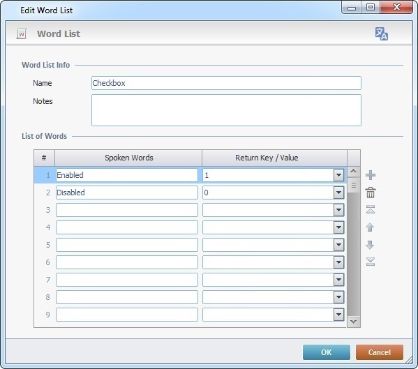 The "Checkbox" word list contains the words "Enabled" (return value is "1") and "Disabled" (return value is "0"). This means that the operator must say just one of the spoken words included in the "Checkbox" word list.