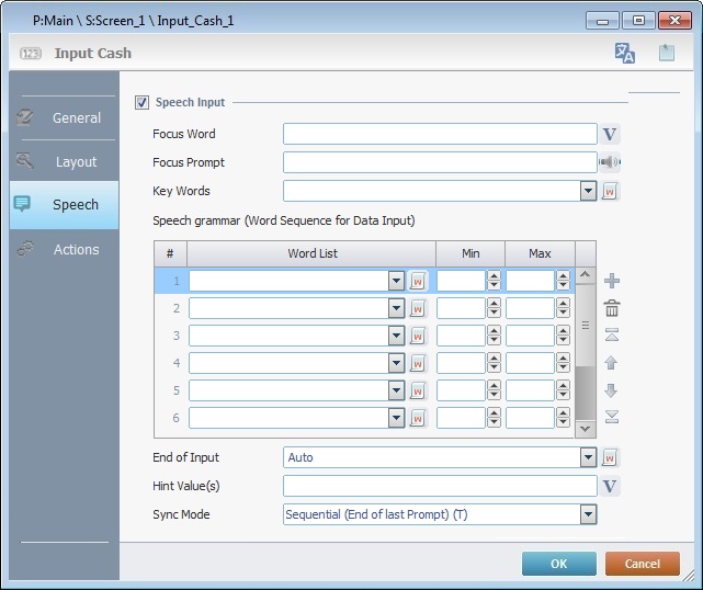 2. In the "Speech" tab of the "Input Cash" (in the "End of Input" option), select the "<Validation_Words>" app word list.
