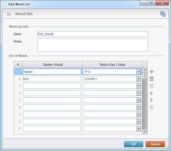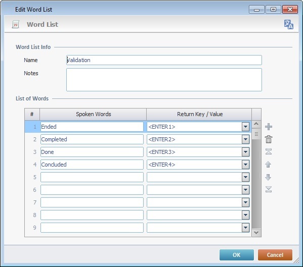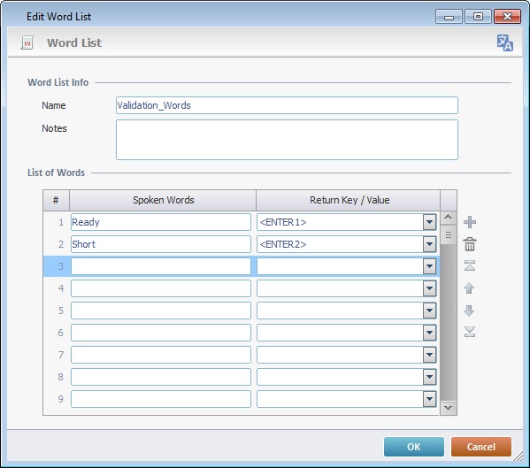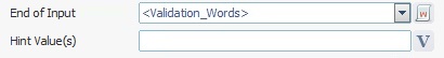 None - speech input ends when the operator uses the maximum length of the input word sequence. Validation Word List - This option is only available in the drop-down if you have already created an app word list with a specific characteristic - this app word list must include spoken words associated to the key code "<Enter>" or "<Enter1>" or <Enter2>", etc. (up to "<Enter9>").