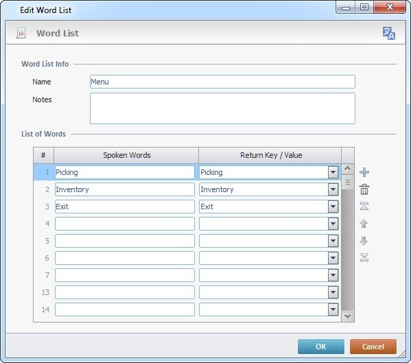 The "Menu" word list contains the words "Picking", "Inventory" and "Exit". This means that the operator must say just one of the spoken words included in the "Menu" word list.