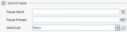 This tab is used to activate the control's speech attribute and to define its use (control focus through speech, prompts, accepted word sequence, etc.).