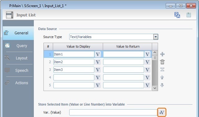 Remember that all speech input data (stored in a variable that is defined in the "General" tab) must be managed with the use of processes in the "Actions" tab.