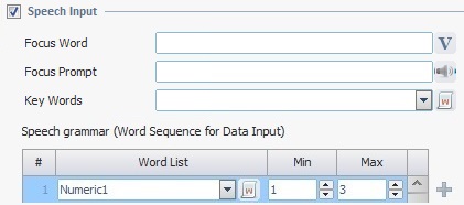 None - speech input ends when the operator uses the maximum length of the input word sequence. Validation Word List - This option is only available in the drop-down if you have already created an app word list with a specific characteristic - this app word list must include spoken words associated to the key code "<Enter>" or "<Enter1>" or <Enter2>", etc. (up to "<Enter9>").