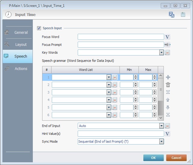 This topic only describes the speech related options included in an "Input Time" control. For more information on this control, see Adding an "Input Time" Control to a Screen.