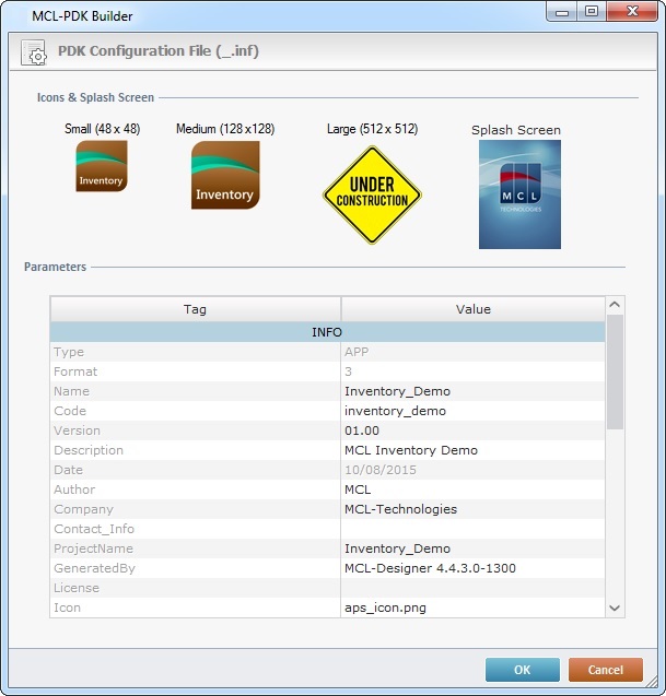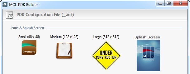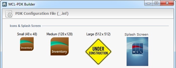 The "PDK Configuration File" window displays a preview of the icon within the PDK for each default icon type (Small 48X48; Medium 128x128M; Large 512x512 and Splash Screen) and a table with the "*.inf" file's parameters.