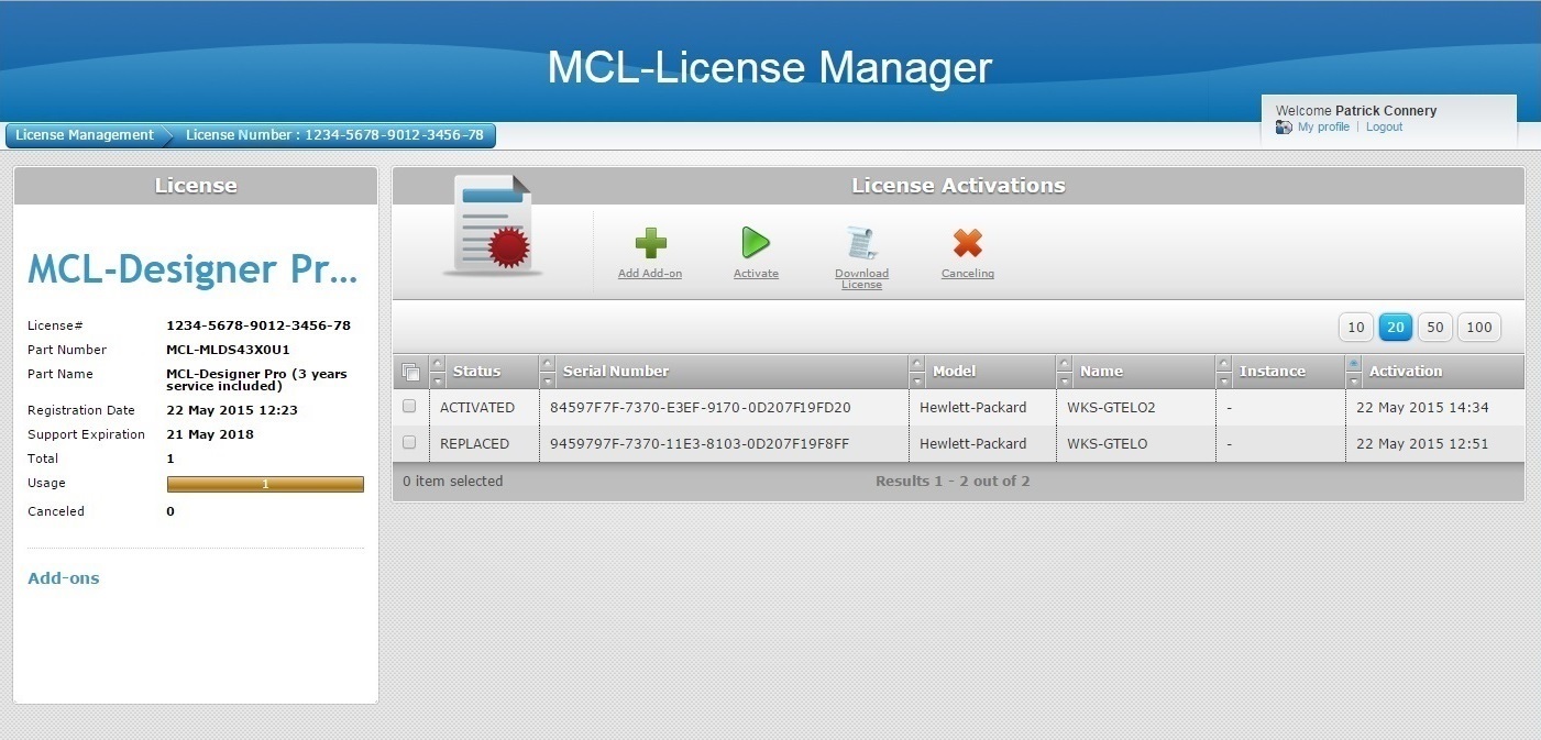 In your MCL-License Manager account, the reactivated license's "License Activations" page displays the replacement: