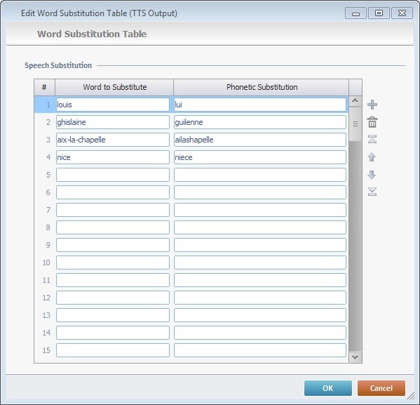 This feature can be used to replace TTS words of the same language (ex: replacing a word prompted in the standard language with the same word prompted in a regional accent) or it can be used to replace a word that, because of its foreign origin, is not prompted properly by the system (ex: a "welcome message" after login, that includes an operator surname that is not part of the defined TTS language. To avoid having a poorly prompted surname, use a TTS substitution to have it sound as it should).