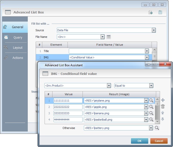 In an "Advanced List Box" control: The path to the four resources used in the control is referred with a relative path (the alias <RES> represents the "Resources folder). |