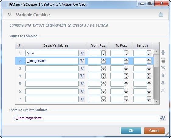 In a "Variable Combine" process that creates a new variable by combining/extracting data from variables: The path to the Resources area is referred with an alias (.\res\). |