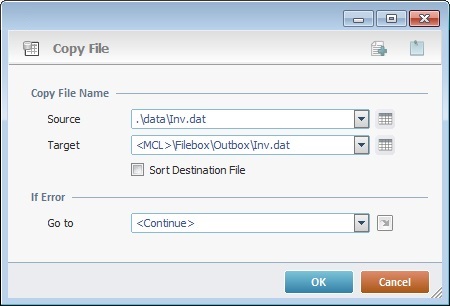 In a "Copy File" process: The source file to be copied ("Inv.dat" in the Data folder) is referred with a relative path and so is the target (the MCL-Mobility Platform's Outbox area). |