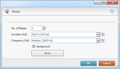 The Beep process is used to play a beep. You can define its duration, frequency and number of repetitions.
