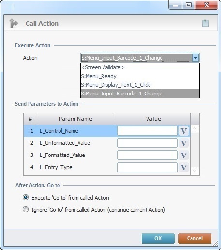 The Call Action process is used whenever the processes of an action need to run outside the action that triggered it. Some parameters can be sent (for example, the formatted value), when calling the "Change" action of an "Input Barcode" control.