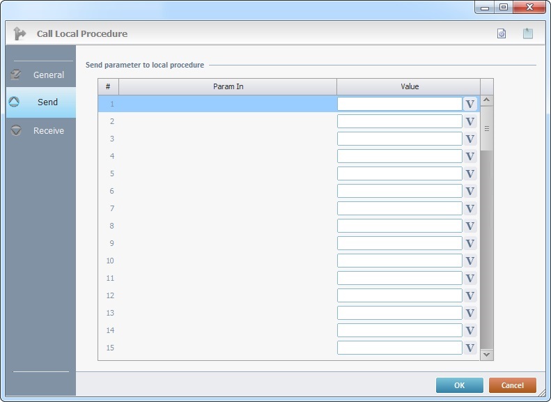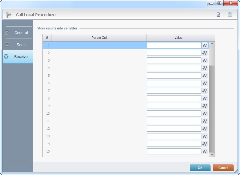 When you add a process, you are required to define its settings. This occurs in the process's properties window which is displayed automatically after having added the Call Local Proc process. In this case, the properties window includes three tabs - "General", "Send" and "Receive".