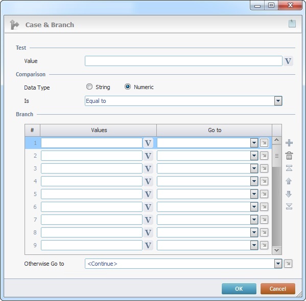 The Case & Branch process has a wider range of comparison values/variables than the Test & Branch process. It enables the comparison between one and multiple values/variables and, therefore, requires as much points in the code (labels, routines, screens, etc) as the number of comparisons.
