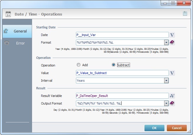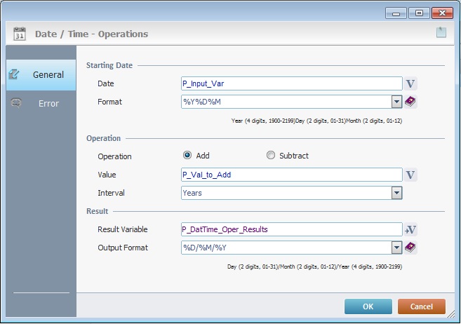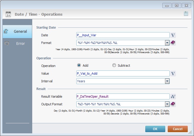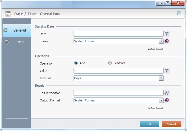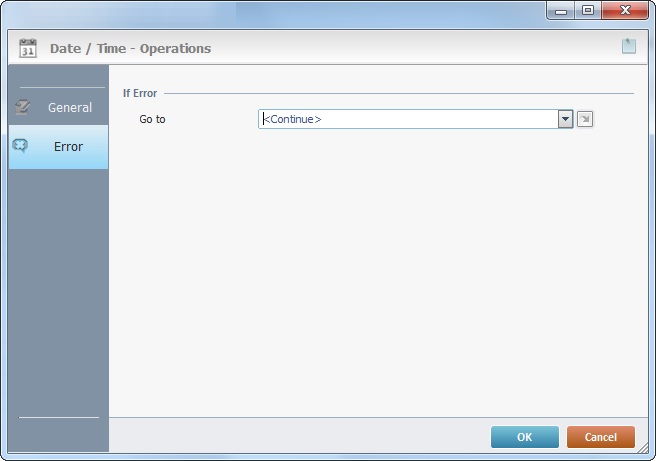 When you add a process, you are required to define its settings. This occurs in the process's properties window which is displayed automatically after having added the Date/Time Operations process. In this case, the properties window includes 2 tabs - "General" and "Error".