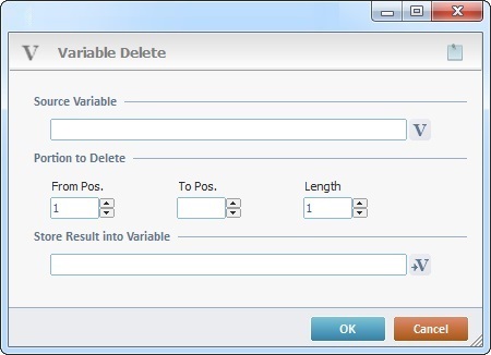 The Variable Delete process is used to delete a part of a string by way of defining the position within that string.