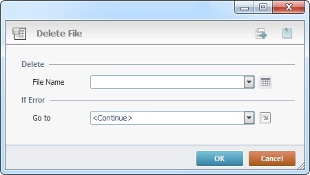 When you add a process, you are required to define its settings. This occurs in the process's properties window which is displayed automatically after having added the Delete File process.