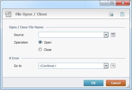 The File Open/Close process is used to open or close a data file. It is particularly useful when working with a data file set to mode “Optimized”. This mode does not automatically close or open the data file, so it is possible to, manually, manage this situation in order to achieve maximum performance (read/write). See Creating a Data File.