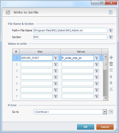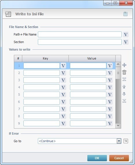 The Write to Ini File process is used to enter data such as key/value pairs into an INI file that is installed in the target device.