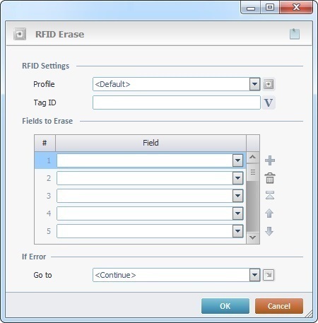 The RFID Erase process is used in a “single tag” operation (synchronous operation) to erase certain information (fields of a memory bank, a password) included in a particular RFID tag. It is NOT possible to erase a full memory bank, only the fields included in it. This process may not be available for all RFID tag types.