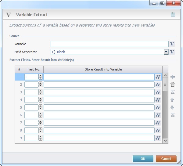 The Variable Extract process is used for variables that contain strings with separators (ex: 5/10/B/H/X/7) - it extracts parts of that string based on a separator and stores the results into new variables. The position(s)/values between separators are considered fields.
