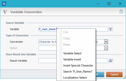 Ex: If you right-click the "Variable" input box (included in a "Conversion's" properties window), you are provided with general editing/search actions and other more specific options such as "Variable Select" (see "Variable Select") ;"Variable Insert" (see "Variable Insert")"Insert Special Character" (see To Insert Special Characters into a Control's Text Input Field) and "Localization Select" (see Localization List).