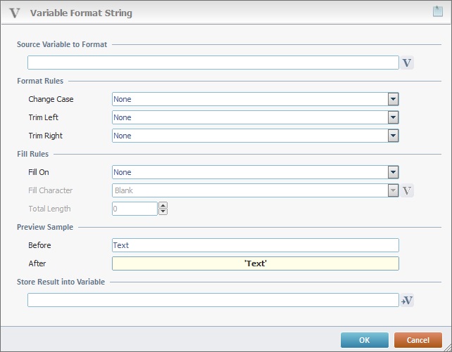 Define the characters that will fill the variable to be formatted. Select between “None”, “Left” or “Right”. If either "Left" or "Right" are selected, it enables the next two options ("Fill Character" and "Total Length"). |
