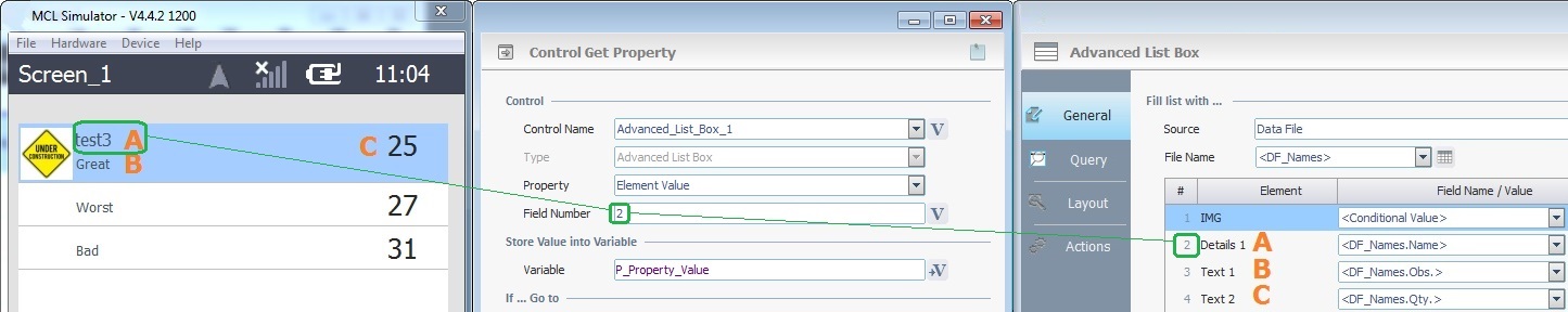 Returns the value displayed in a "Text"/"Button" element of the control's selected/highlighted record row (defined in the "Field Number" option). When defining the field number consider the control's style, specifically, the order of the existing elements. If the target field contains an "image" element, the returned value will consist of the path+image name. Ex: Consider that the control contains 4 rows and 3 "text" elements ("A", "B" and "C") and that the control's selected/highlighted row is the first. If you enter "2" in the "Field Number" option, you will retrieve the displayed value in the second element ("A") which is located in the second row.