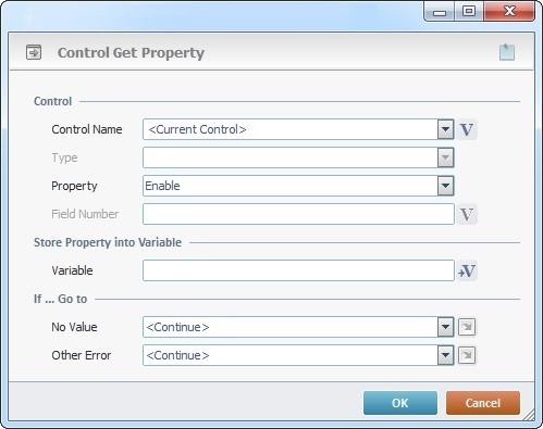 If you selected a control from the "Control Name's"drop-down list, this option will automatically display its corresponding type and will NOT be editable. If you used a value within a variable to define the required control, you must select a control type from the drop-down list. |