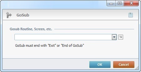 The GoSub process is used to call a label (part of code packaged as a unit), a routine or a screen under the form of a subroutine/function. This means that the called element should end its process with a "Go to < Exit>" (in the case of a called screen) OR a "Go to <End of GoSub>" (when calling a label, a routine, etc.).