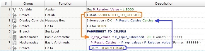 Using a "GoSub: <element>" (a label, a routine, etc.) jumps the workflow to the specified target - in this case, the label "FAHRENHEIT_TO_CELSIUS".