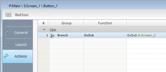 There is a button control in "Screen_1" that includes a "GoSub" to call "Screen_2". "Screen_2" uses another button with a "Go to: <Exit>", added at the end of its process execution, to return to the calling element - "Screen_1".