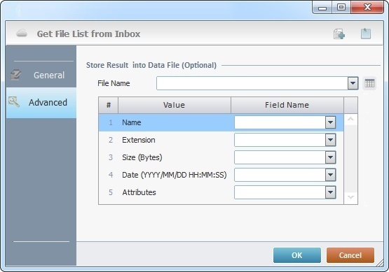 Select the data file field to receive the file name information from the drop-down list. |