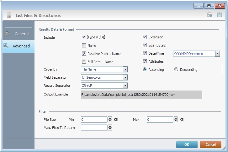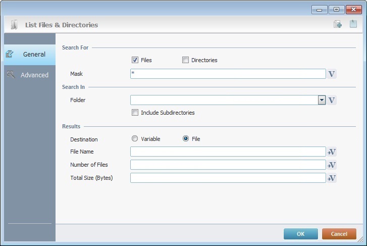When you add a process, you are required to define its settings. This occurs in the process's properties window which is displayed automatically after having added the List Files & Directories process. In this case, the properties window includes two tabs - "General" and "Advanced".