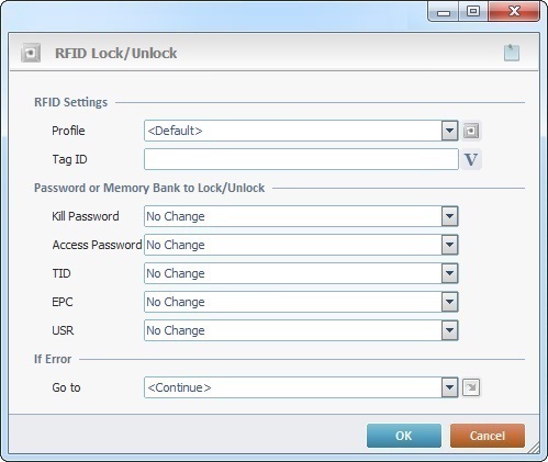 Select the appropriate option from the drop-down list for each element: No Change - There is no lock/unlock function attributed to this element. Unlock - There is unlimited access to this element (password location or memory bank) which is readable and writable. The "unlock" status may change throughout the application. Perma unlock - There is unlimited access to the password's location or memory bank (elements are readable and writable). This is permanent, cannot change throughout the application. Read/Write Secured Access - You can read/write the tag's elements (password location and memory banks), if you access them via a password (the tag is in a secured state). Specifically: •The Read Secured Access only applies to the "access password" and the "kill password". •The Write Secured Access applies to all writable memory banks. Permanently Locked - The tag's password location/memory banks are permanently inaccessible. It is not possible to read/write them.