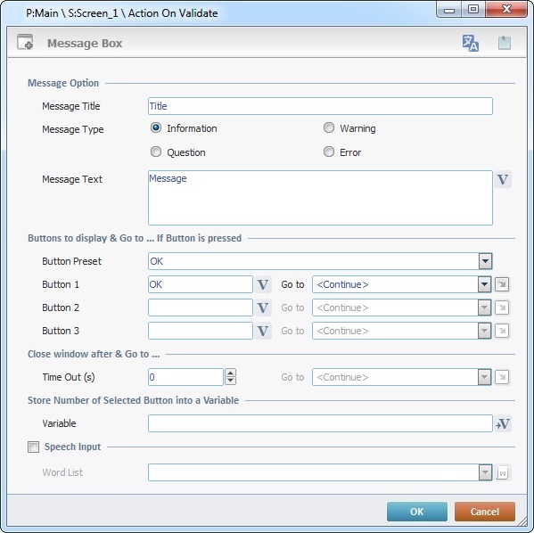 Decide on the type of message box by checking "Information"; "Warning"; "Question" or "Error". See Detail of Message Box Types below. |