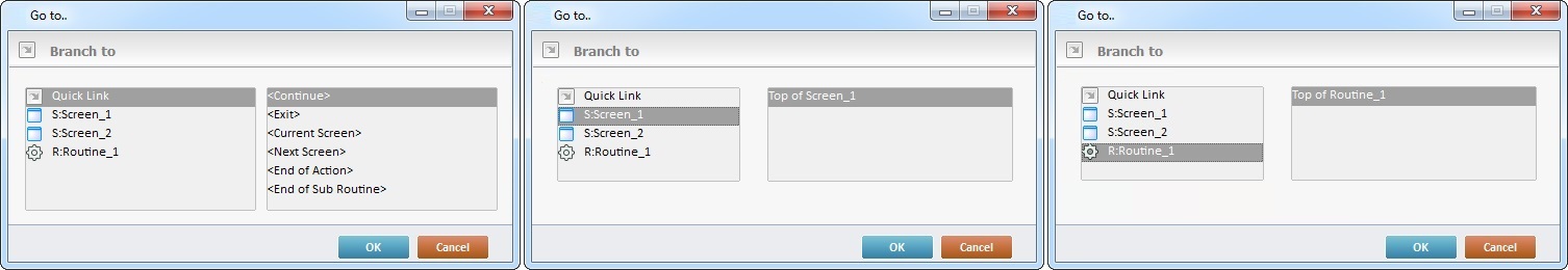 This window is an alternative to the drop-down list of destinations. Select a destination screen or routine within the same program as this control, in the left table. Specify the target even more by selecting from the table to the right. The available options are a consequence of your choice in the left table. If you want to add more processes, select the <Action> option. Finish this operation by clicking |