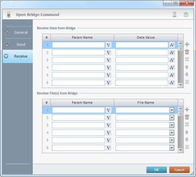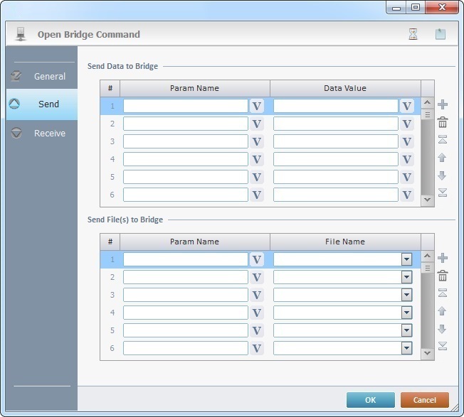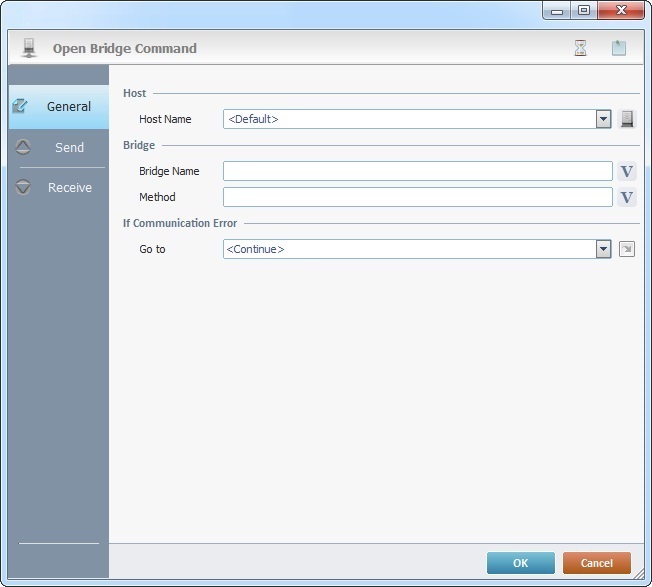 When you add a process, you are required to define its settings. This occurs in the process's properties window which is displayed automatically after having added the Open Bridge Command process. In this case, the properties window includes three tabs - "General", "Send" and "Receive".