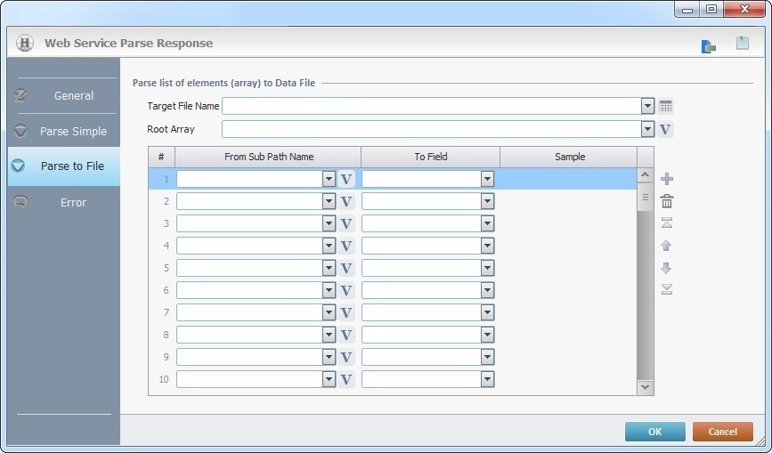 Define the elements you want to store into data file fields. Select the Path Name(s) from the drop-down list OR click If you have defined the root array with the use of the"Body to Use for Parsing" window, you may already have these fields filled in (the drag-and-drop of the array from the "Body to Use for Parsing" window allows for the automatic retrieval of the existing path names and the filling in of this column. |