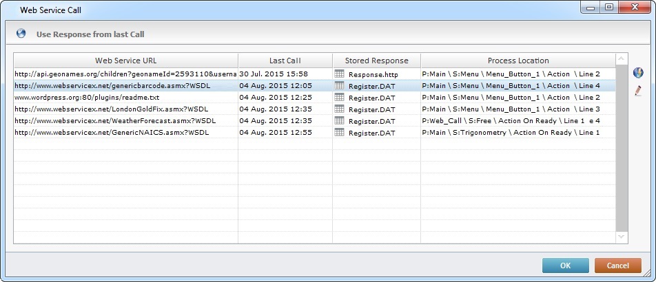 If you want to use the response of a web service being used within the project, click this button to automatically retrieve a list of the URLs being used in all "Call & Parse" process(es).