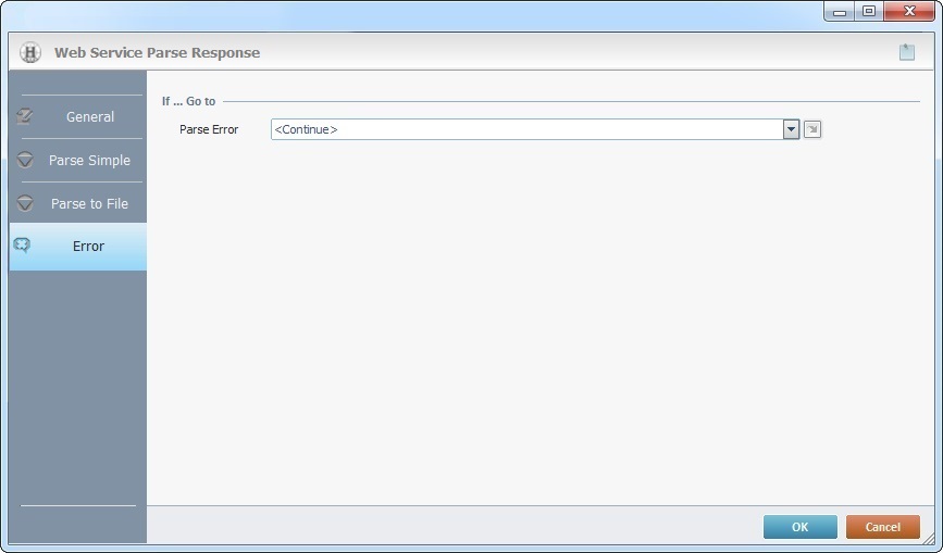 When you add a process, you are required to define its settings. This occurs in the process's properties window which is displayed automatically after having added the Parse Response process. In this case, the properties window includes four tabs - "General", "Parse Simple", "Parse to File" and "Error".