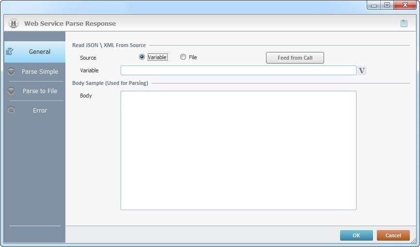 The web service response (body) to be parsed can be defined through an HTTP request included in the project (ex: a URL defined in the "Call & Parse" process) or you can retrieve the information from a variable, a data file or have it copied/pasted from an outside source.