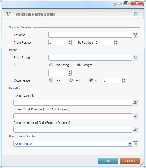 The parsing is done within a position range. It starts when the “Start string” is found and stops when the “End String” is found or when the specified number of characters is achieved.