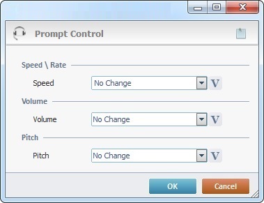The Control Prompt process sets the values for a prompt's speed, volume and pitch. These values affect speech outputs that follow this process in the speech dialog (between the system and the operator's speech input).