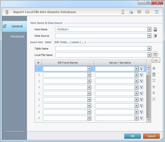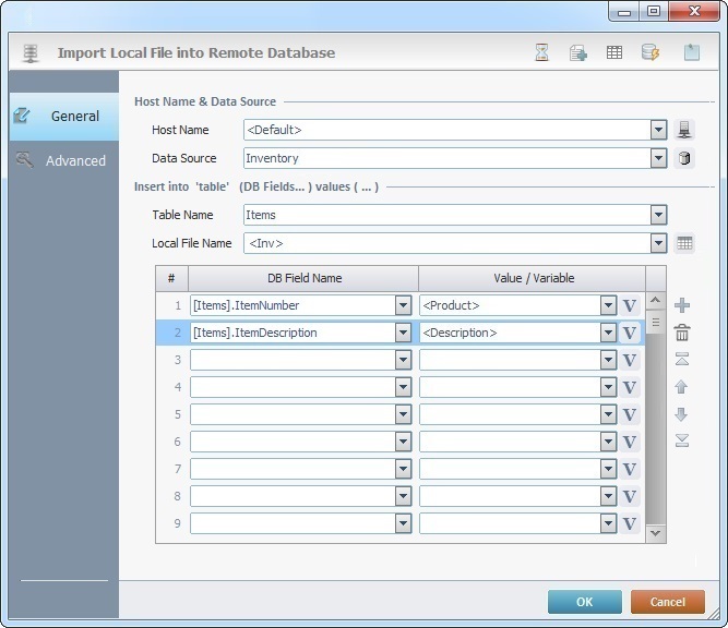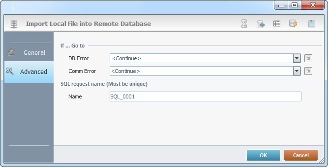 When you add a process, you are required to define its settings. This occurs in the process's properties window which is displayed automatically after having added the Local File to DB process. The properties window includes two tabs - "General" and "Advanced".